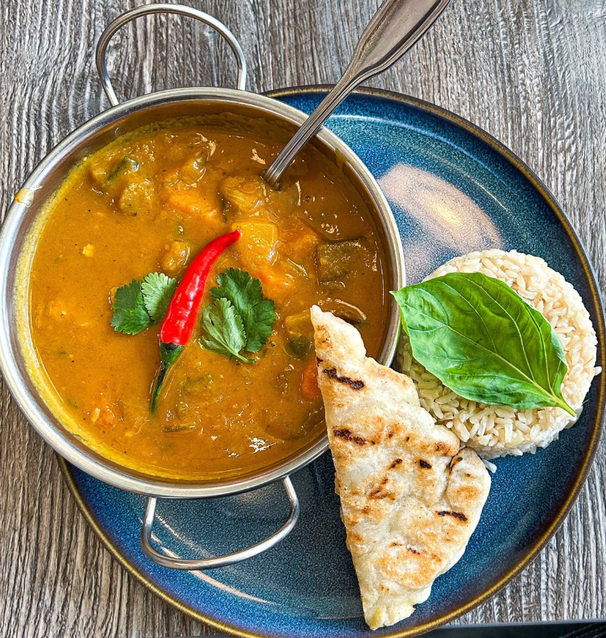 Spicy vegan vegetable curry, with assorted vegetables, chickpeas, coconut milk, pumpkin, peppercorns, brown rice, and mini naan flatbread. GF. Vegan.